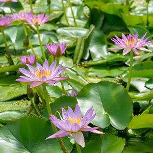 Eén van de bekendste waterplanten en om goede redenen! De bekervormige knoppen openen om de betoverende stervormige blauwe bloemen met goudkleurige helmknoppen te laten zien. Het groeit in 30-60 cm diep water en is geschikt voor grote vijvers en meren. Het blad kan een diameter hebben tot 30cm en de gehele plant kan een diameter hebben tot 150cm.
