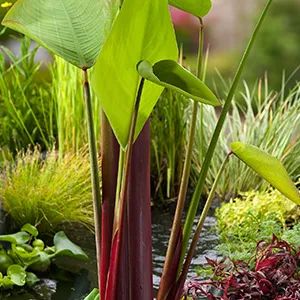 Deze polvormende, halfwintergroene moeras- of oeverplant behoort tot een soort die voorkomt in moerassen en langs rivieren van het zuiden van de USA en daar wel 300 cm hoog kan worden. Deze cultivar valt sterk op door de zware rode bladstengels vanuit de basis. De bladeren kunnen tot 75 cm lang worden. De violette bloemen (binnen behaarde groene kelkbladen) verschijnen in grote vertakte trossen aan de bloeistengeltoppen . Daarna ontstaan kleine, ronde vruchtdoosjes met elk één donkerbruin zaad. Niet-winterhard. De plant moet koel en vorstvrij overwinteren en wordt daarom wel als, kuipplant beschouwd. Voor een plek in zon en natte vijvergrond.